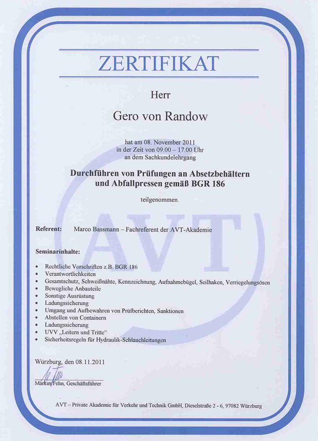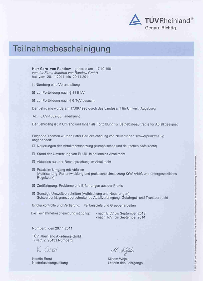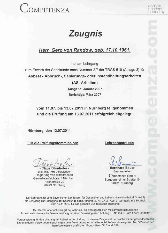 Die Manfred von Randow GmbH bietet kommunalen und gewerblichen Kunden zertifizierte Qualität im Bereich der Asbest-Entsorgung mit Sachkundenachweis nach TRGS 519. Zahlreiche zufriedene Kunden finden sich in Roth, Nürnberg, Schwabach, Neumarkt und Hilpoltstein.
